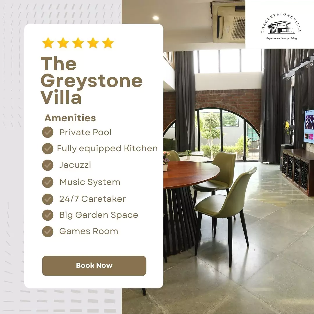 The Greystone Villa is a luxury 2BHK villa in Jaipur with an outdoor pool, jacuzzi, and stylish interiors. Ideal for private parties and relaxing getaways.